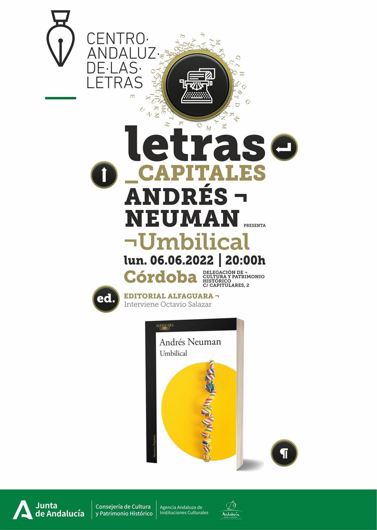 El Centro Andaluz de las Letras presenta el próximo lunes, día 6 de junio, el nuevo libro de Andrés Neuman, 'Umbilical', publicado por la editorial Alfaguara. El acto, que tendrá lugar en la Delegación Territorial de Cultura y Patrimonio Histórico a las 20,00 horas, contará con la asistencia del jurista Octavio Salazar, que dialogará con el autor.