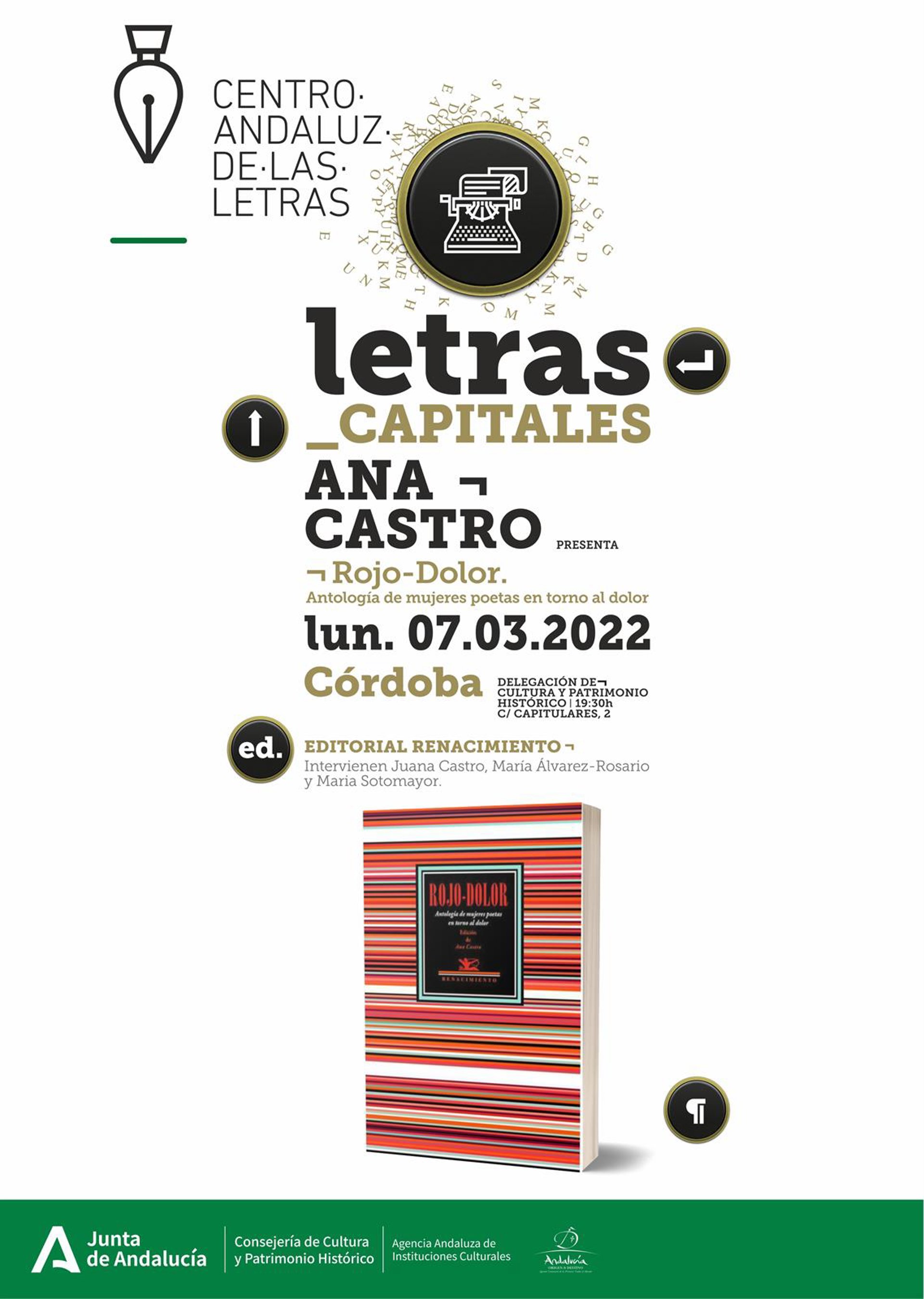 La Consejería de Cultura y Patrimonio Histórico, a través de la Agencia Andaluza de Instituciones Culturales, presenta el próximo lunes, día 7 de marzo, la nueva antología de Ana Castro 'Rojo-Dolor. Antología de mujeres poetas en torno al dolor', publicada por la editorial Renacimiento.