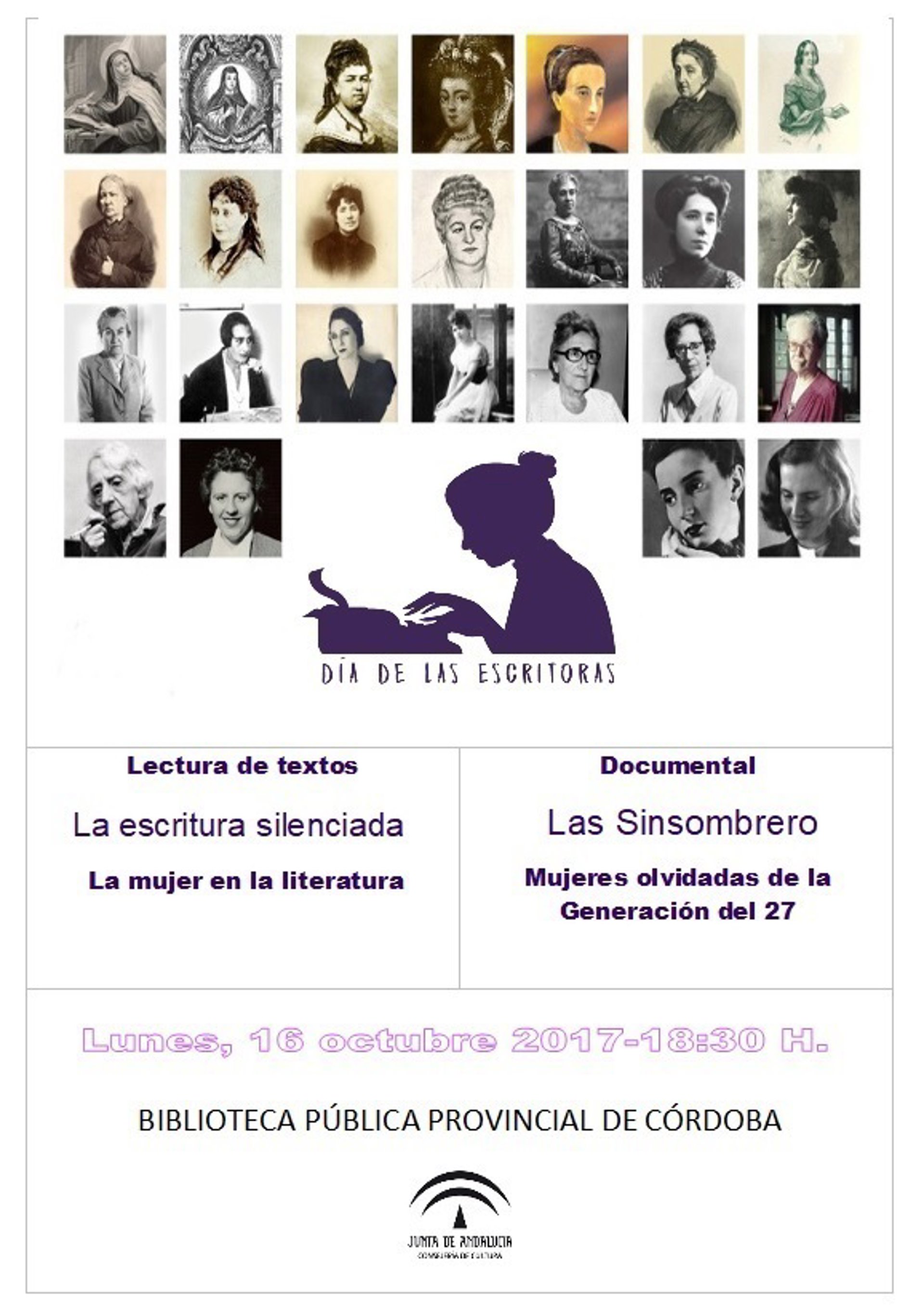 La Biblioteca Pública Provincial acogerá el próximo lunes, a las 18,30 horas, una lectura continuada de textos de escritoras poco conocidas bajo el lema 'La escritura silenciada: mujeres en la literatura', y proyectará el documental 'Las sin sombrero', sobre las mujeres de la Generación del 27, dentro de las actividades organizadas por la Consejería de Cultura con motivo del Día de las Escritoras.