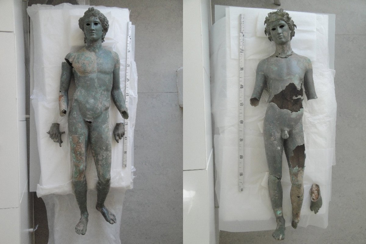 Las dos figuras de bronce se fechan entre el siglo I y el siglo II de nuestra era y, en concreto, el efebo apolíneo mide 140,5 centímetros de altura, es una figura exenta, fragmentada y casi completa. Se trata de una derivación romana de originales griegos, basados en atletas vencedores y representa un efebo portador de lámparas, desnudo y con un peinado que recuerda al dios Apolo.