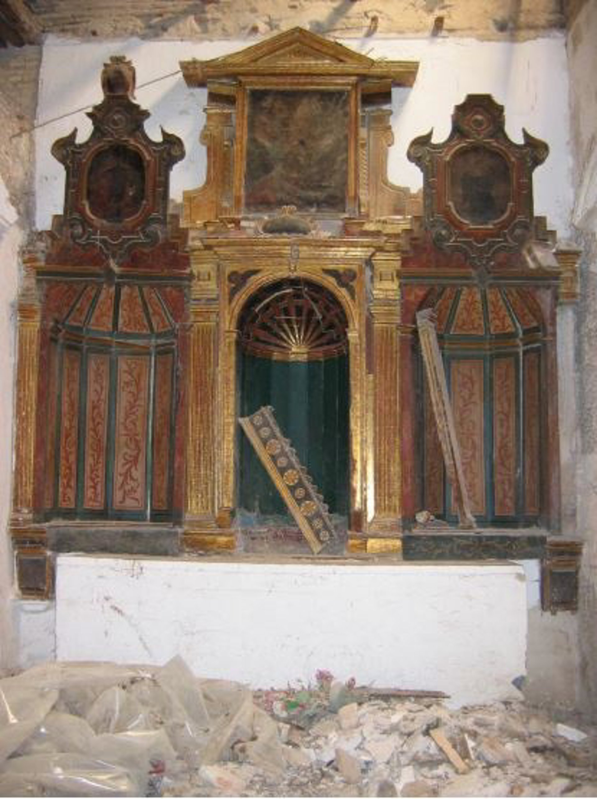 La calle central presenta hornacina dorada con arco de medio punto que apoya sobre pilastrillas que enmarcan el nicho de bicromía verde y dorada. El ático presenta registro central para lienzo enmarcado por pilastras laterales y frontón triangular en dorado. El lienzo que ocuparía el espacio central está perdido. Por fotografías antiguas se sabe de la presencia de dos figuras, una de ellas ataviada con túnica roja y manto oscuro.