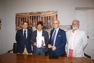 El delegado territorial de Economía, Innovación, Ciencia y Empleo de la Junta de Andalucía en Córdoba, Manuel Carmona, acompañado del alcalde de Montilla (Córdoba), Rafael Llamas, el gerente de Relaciones Institucionales de Orange España en Zona Sur, Raúl Maldonado, y del director territorial de Escuela de Organización Industrial (EOI), Agustín Galiana, ha dado a conocer este jueves el lanzamiento del programa de formación online 'Sé Digital Andalucía', para impulsar el desarrollo de la economía en el citado municipio cordobés.