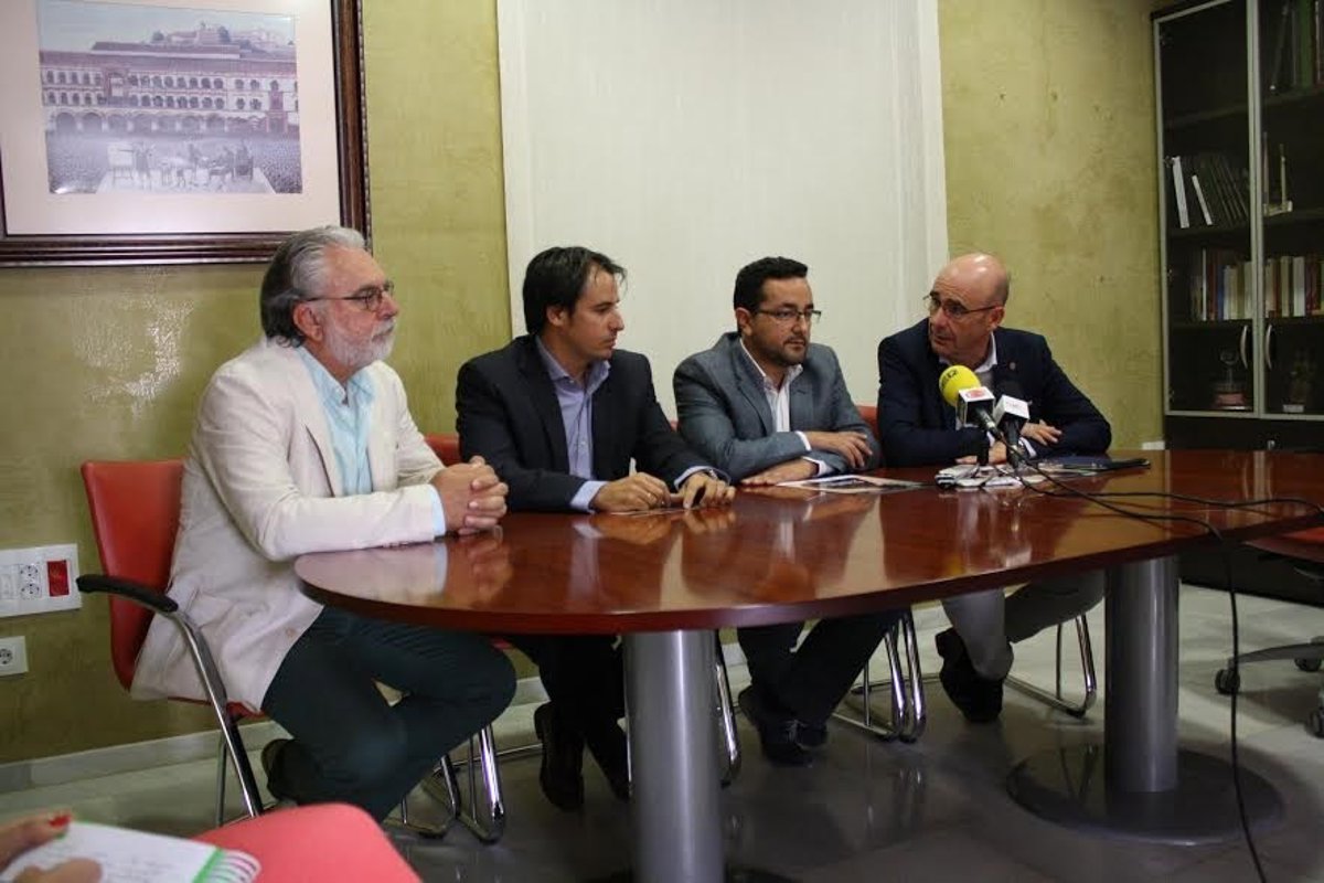 El delegado territorial de Economía, Innovación, Ciencia y Empleo de la Junta en Córdoba, Manuel Carmona, acompañado del alcalde de Baena (Córdoba), Jesús Rojano, el gerente de Relaciones Institucionales de Orange España en Zona Sur, Raúl Maldonado, y del director territorial de Escuela de Organización Industrial (EOI), Agustín Galiana, han presentado este martes el lanzamiento del programa de formación online 'Sé Digital Andalucía' en este municipio cordobés.