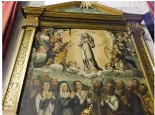 La escena que representa se divide en dos planos diferenciados. La parte inferior, la terrenal donde aparecen figuras arrodilladas y destaca un personaje masculino con túnica blanca y manto rojo y otro femenino con atuendo del siglo XVI. Ambos con otras figuras en posición orante y ataviados con túnicas.