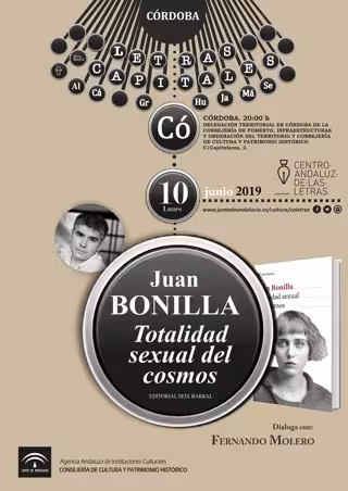 La Consejería de Cultura y Patrimonio Histórico, a través del Centro Andaluz de las Letras (CAL), organiza en Córdoba y Sevilla la presentación de la nueva novela de Juan Bonilla 'Totalidad sexual del cosmos' (Seix Barral), dentro del ciclo literario 'Letras Capitales', donde el autor recupera en su libro la figura de Nahui Olin, una de las mujeres más carismáticas del arte mexicano del siglo XX.