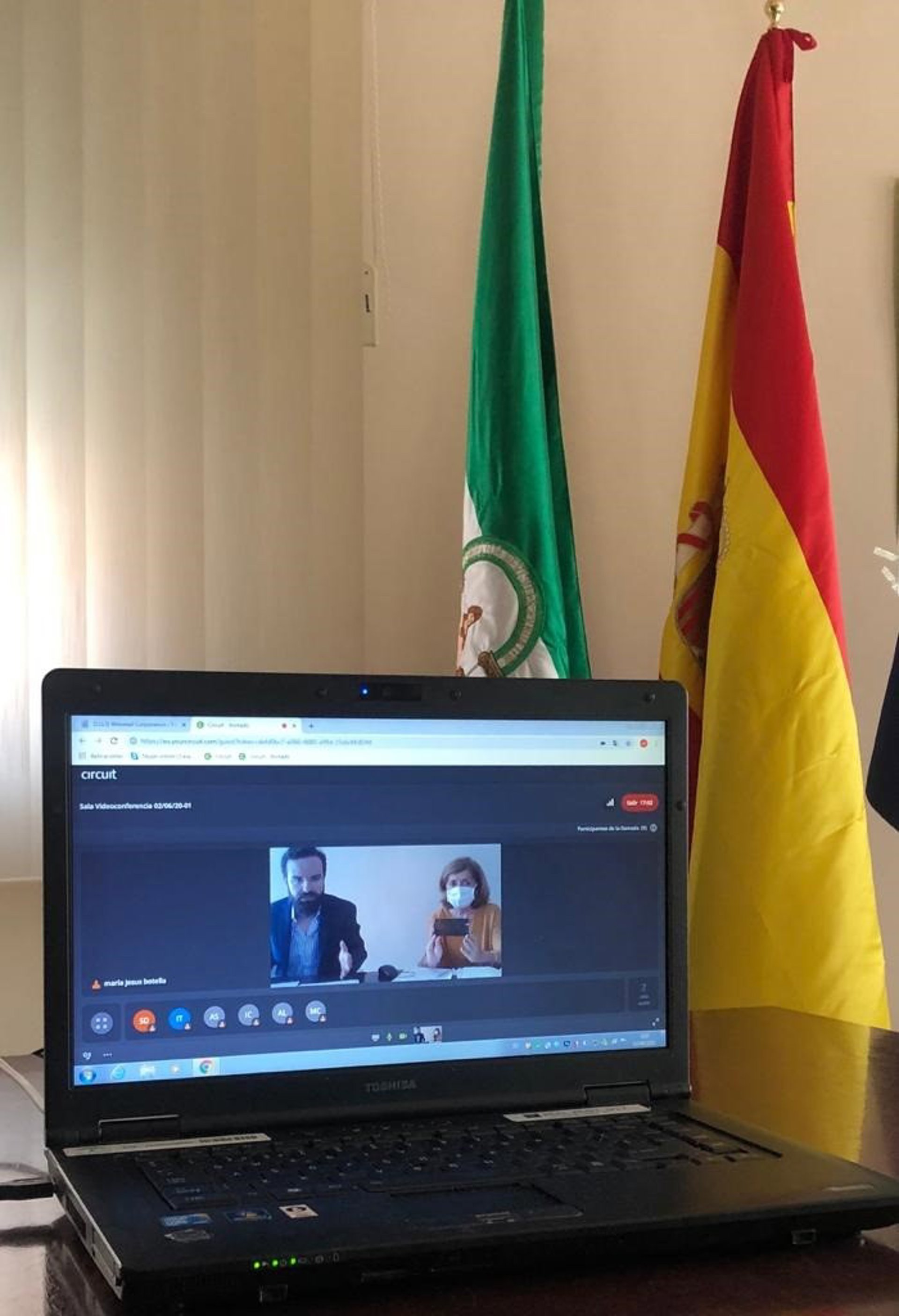 La delegada territorial de Salud y Familias, María Jesús Botella, y el director de la Inspección Provincial de Servicios Sanitarios, Eutimio Tercero, durante la videoconferencia - JUNTA DE ANDALUCÍA