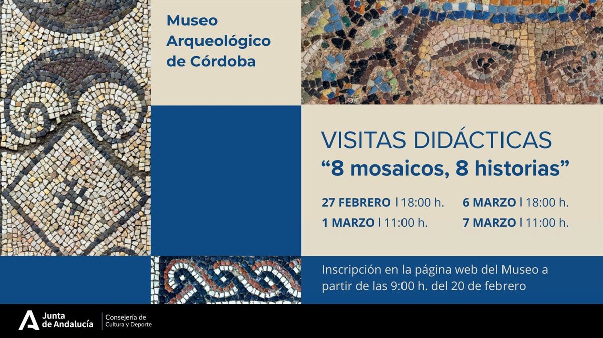 El Museo Arqueológico de Córdoba pone en marcha un programa de visitas didácticas, el día 27 de febrero y los días 1, 6 y 7 de marzo, a la exposición temporal '8 mosaicos, 8 historias', recientemente prorrogada hasta el próximo 15 de marzo, con el objetivo de brindar al público una oportunidad única para acercarse a la riqueza y diversidad del arte musivario en la Córdoba romana.