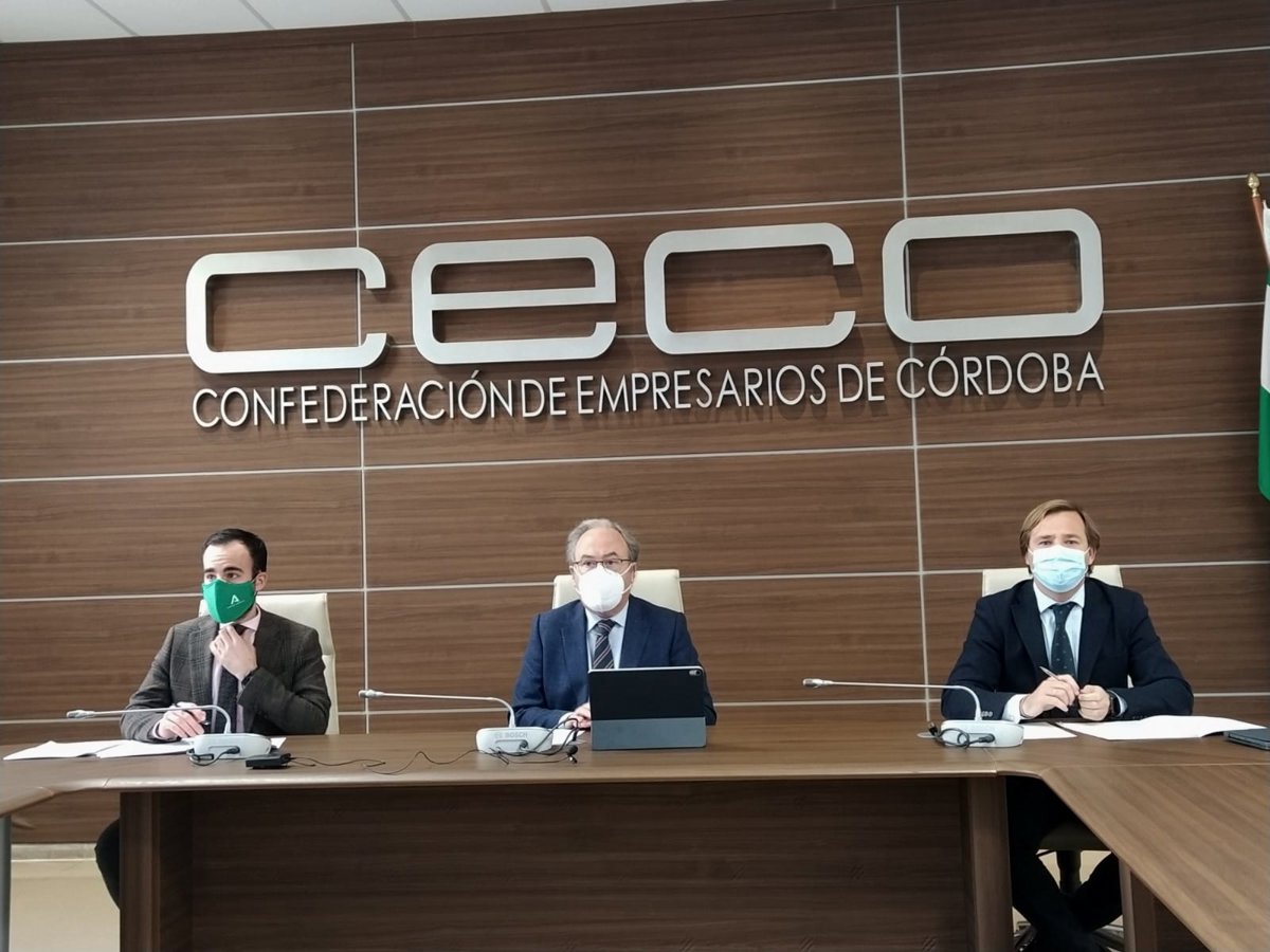 El delegado de Empleo, Formación y Trabajo Autónomo de la Junta de Andalucía en Córdoba, Ángel Herrador, ha estado este martas en la sede de la Confederacióno de Empresarios de Córdoba (CECO) en un 'webinar', junto con el delegado de Gobierno andaluz, Antonio Repullo, y el presidente de CECO, Antonio Díaz, para presentar esta línea de ayudas y las otras nueve que componen el Plan de Apoyo a Pymes y Autónomos aprobado por el Gobierno andaluz.