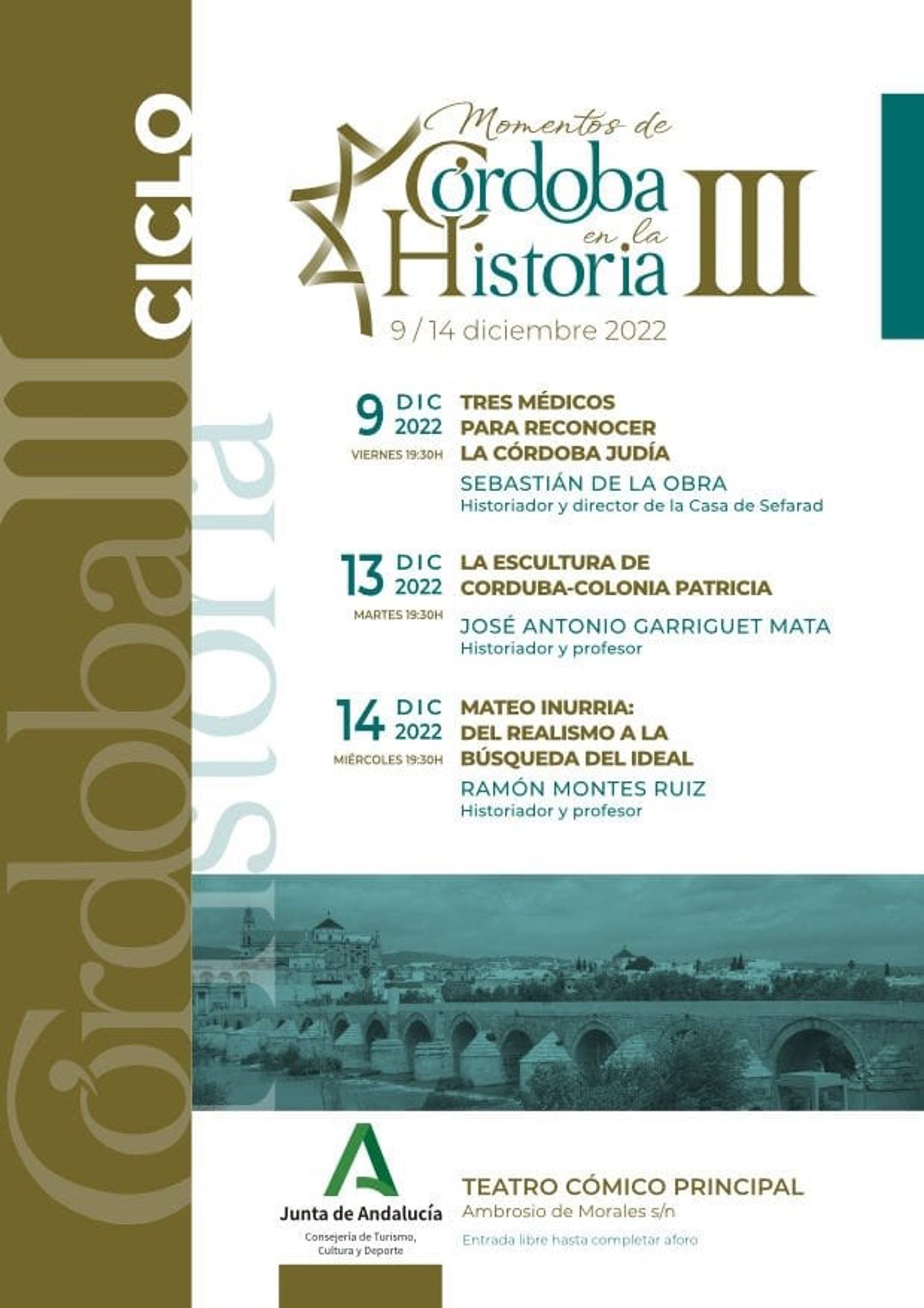 El ciclo comenzará el viernes con la presencia del historiador y director de la Casa de Sefarad, Sebastián de la Obra, que ofrecerá la ponencia 'Tres médicos para reconocer la Córdoba judía', y continuará el martes 13 de diciembre con el historiador y profesor de la Universidad de Córdoba (UCO) José Antonio Garriguet Mata que, en su caso, ofrecerá una conferencia sobre 'La escultura en la Colonia Patricia de Corduba'.