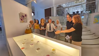 Han acompañado a la pintora en el recorrido por la exposición la jefa de Departamento de Difusión, Rosa García Blanco, y los directores de las dos instituciones que comparten sede, Mariano Boza, de la Biblioteca Provincial de Granada, y Javier Álvarez, de la Biblioteca de Andalucía.