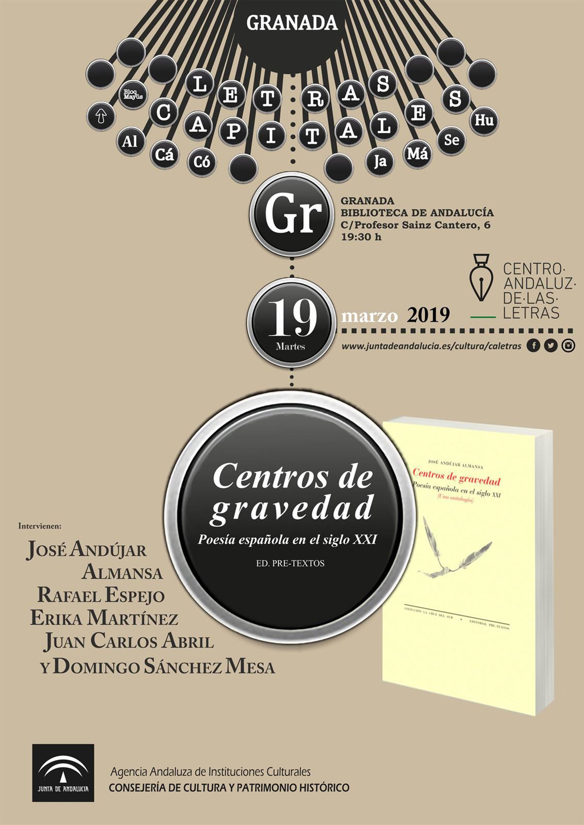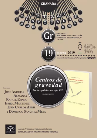 La Consejería de Cultura y Patrimonio Histórico, a través del Centro Andaluz de las Letras, presenta este martes en Granada la antología 'Centros de gravedad. Poesía española en el siglo XXI', de la editorial Pre-Textos, en edición de José Andújar.