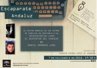 La Consejería de Cultura, a través del Centro Andaluz de las Letras (CAL), presenta este miércoles en Granada la novela 'El despertar del vencejo' del escritor Daniel Borrego Lara en una actividad enmarcada en el ciclo Escaparate Andaluz.