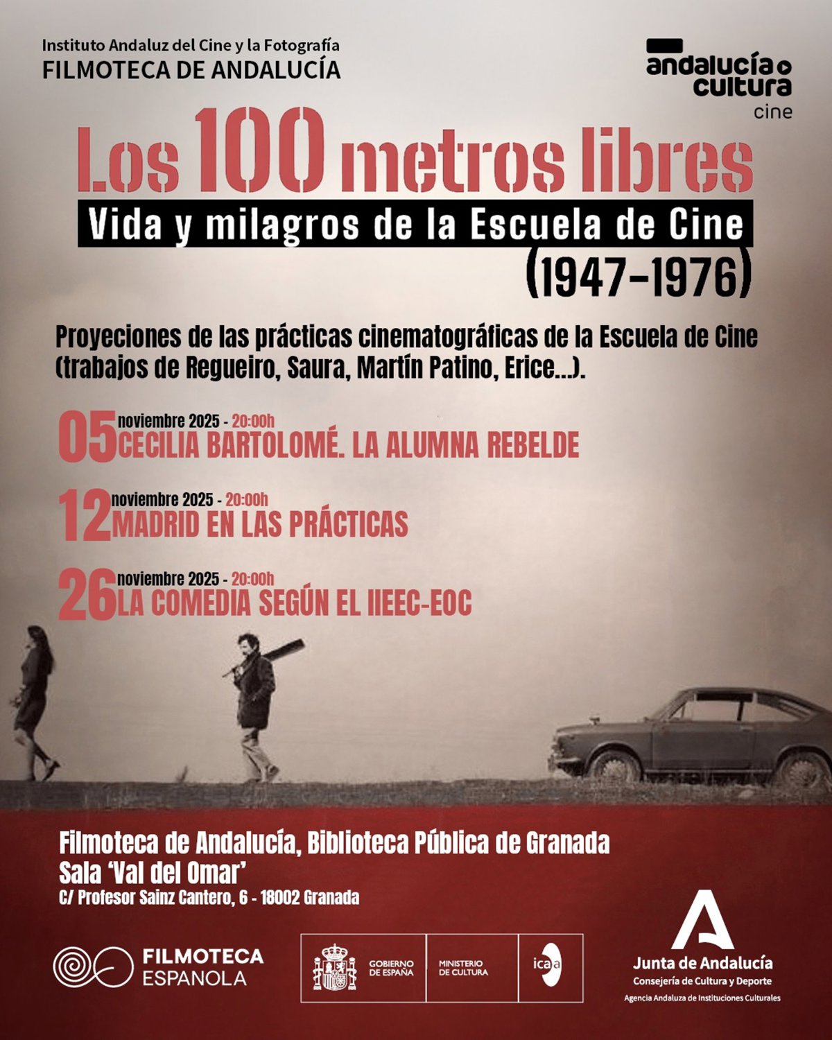 La Filmoteca de Andalucía, dependiente de la Consejería de Cultura y Deporte y gestionada a través de la Agencia Andaluza de Instituciones Culturales, inicia este miércoles, 5 de noviembre, a las 20,00 horas en su sede en Granada 'Los cien metros libres. Vida y milagros de la Escuela de Cine (1947-1976)'.