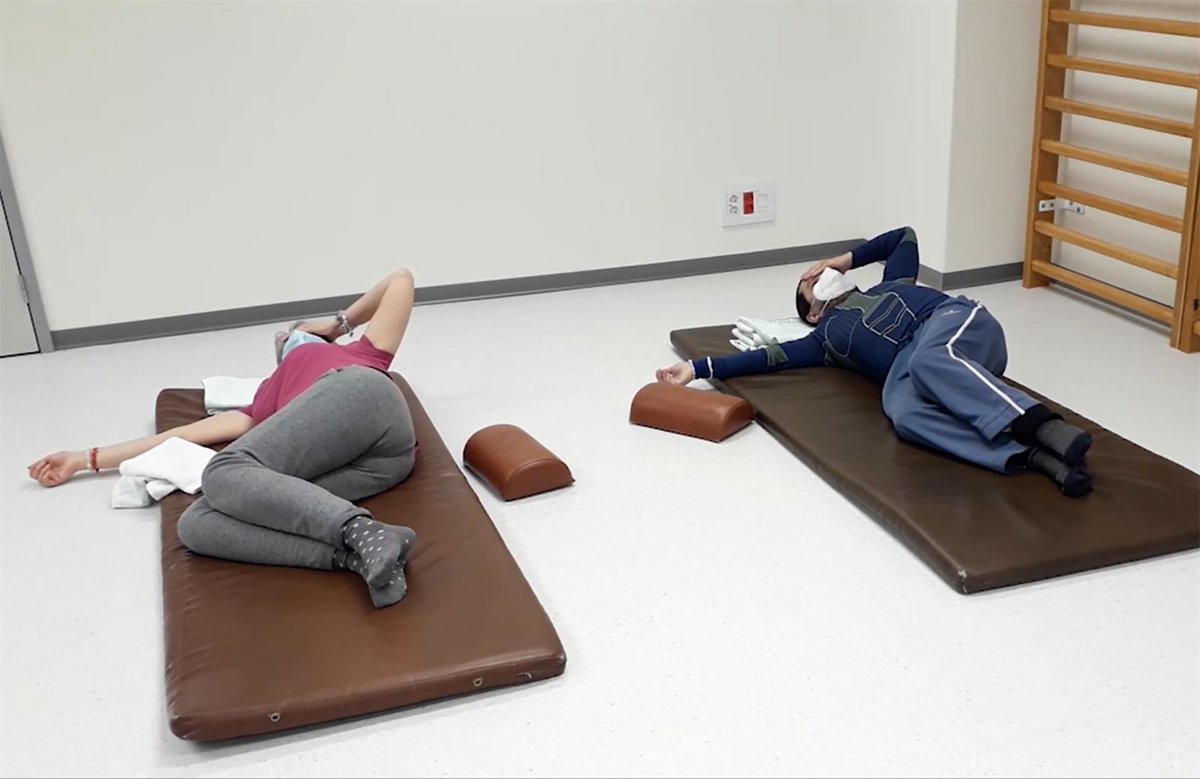 Rosario Vargas, fisioterapeuta del servicio de Medicina Física y Rehablitación del Clínico San Cecilio va guiando a dos pacientes de Agrafim de forma sencilla en la realización de las distintas actividades, empleando para ello materiales de los que se puede disponer fácilmente en un domicilio. Se trata de un modelo de ejercicio terapéutico basado en el método de cadenas musculares y articulares Godelieve Denys-Struyf y el Método Feldenkrais que permite aliviar el dolor generalizado a través de estas sesiones.