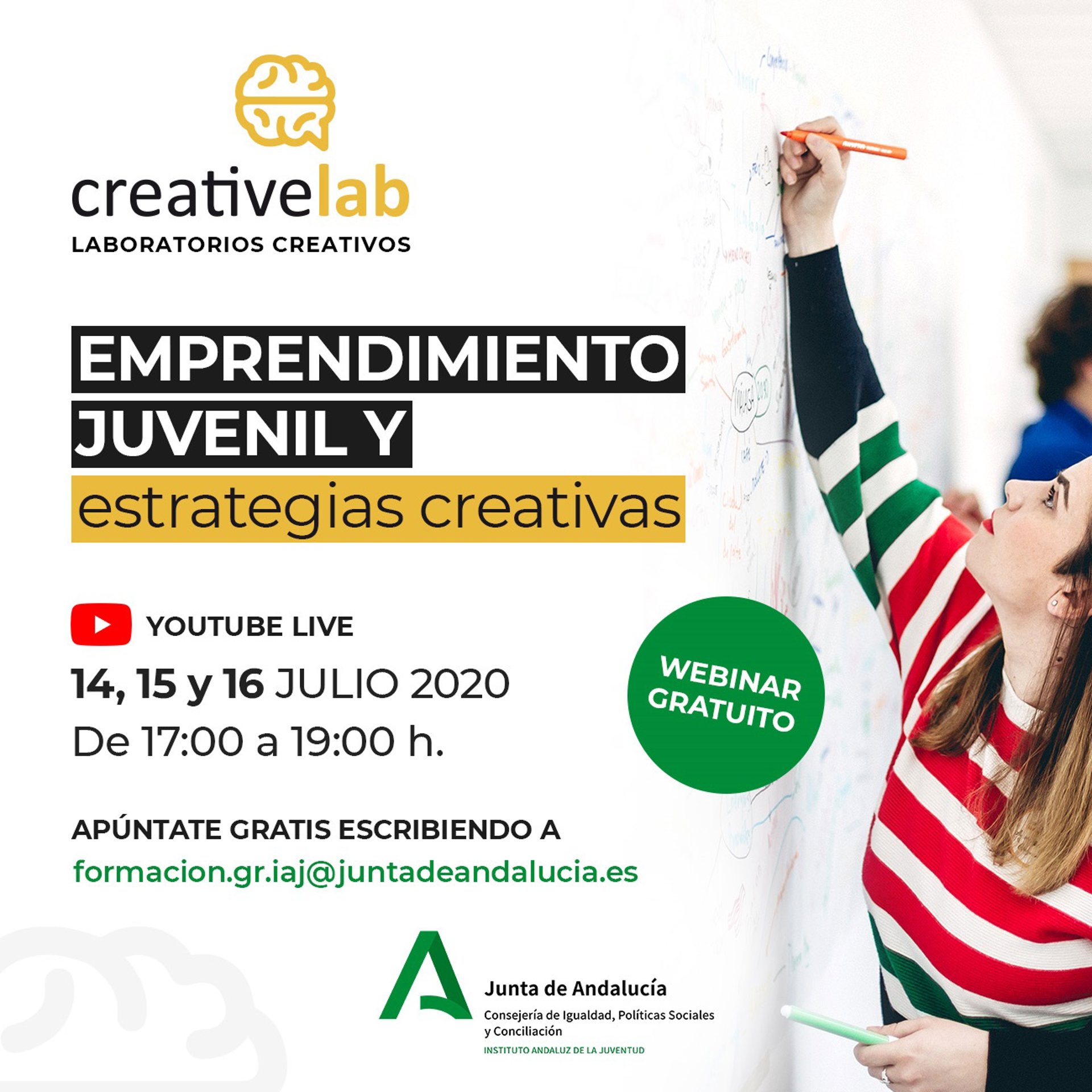 Los jóvenes interesados deben mandar un email a 'formacion.gr.iaj@juntadeandalucia.es' con el nombre y apellidos, DNI, edad, actividad en la que estén interesados y correo electrónico donde se le enviará el enlace para participar en el taller seleccionado.