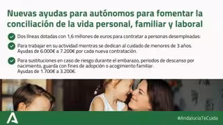 Cartel informativo sobre las ayudas de la Consejería de Empleo, Formación y Trabajo Autónomo destinadas a facilitar la conciliación de la vida personal, familiar y laboral que, por primera vez, están dirigidas exclusivamente para autónomos. - JUNTA DE ANDALUCÍA