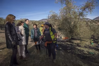 La delegada del Gobierno andaluz en Granada, Sandra García, junto al delegado de Agricultura, Pesca y Desarrollo Rural, Manuel García Cerezo, a la coordinadora del Instituto Andaluz de la Mujer (IAM), Ana Belén Palomares, y a la alcaldesa de Moclín, Fina Caba, han visitado la Finca Cortijo de Enmedio, que ocupa una extensión de 273 hectáreas en este municipio, donde las medidas de la Junta han permitido la contratación de una treintena de mujeres jornaleras, en su mayoría jóvenes, para la campaña del olivar.