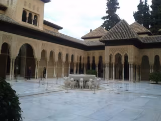 El Patio de los Leones fue construido durante el segundo mandato de Muhammad V (1362-91) para ser residencia real. Está organizado en dos terrazas a distinto nivel y sus habitaciones se distribuyen en torno a un espacio rectangular en cuyo centro se levanta la fuente. Se rodea por un pórtico de esbeltas columnas de mármol procedente de las canteras de Macael al que se abren las cuatro principales dependencias del palacio.