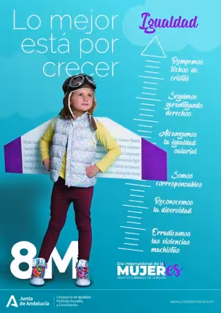 Asimismo, en la imagen que ilustra la campaña se utiliza una metáfora en la que se relaciona el metro que hay en todos los hogares para medir el crecimiento de niñas y niños, uniéndolo a los distintos retos que todavía hay que afrontar: "reconocimiento de la diversidad, alcanzar la igualdad salarial, romper todos los techos de cristal, superar los suelos pegajosos que nos lastran, seguir garantizando derechos, que la corresponsabilidad y la conciliación sean una realidad e indudablemente erradicar todas las violencias machistas".