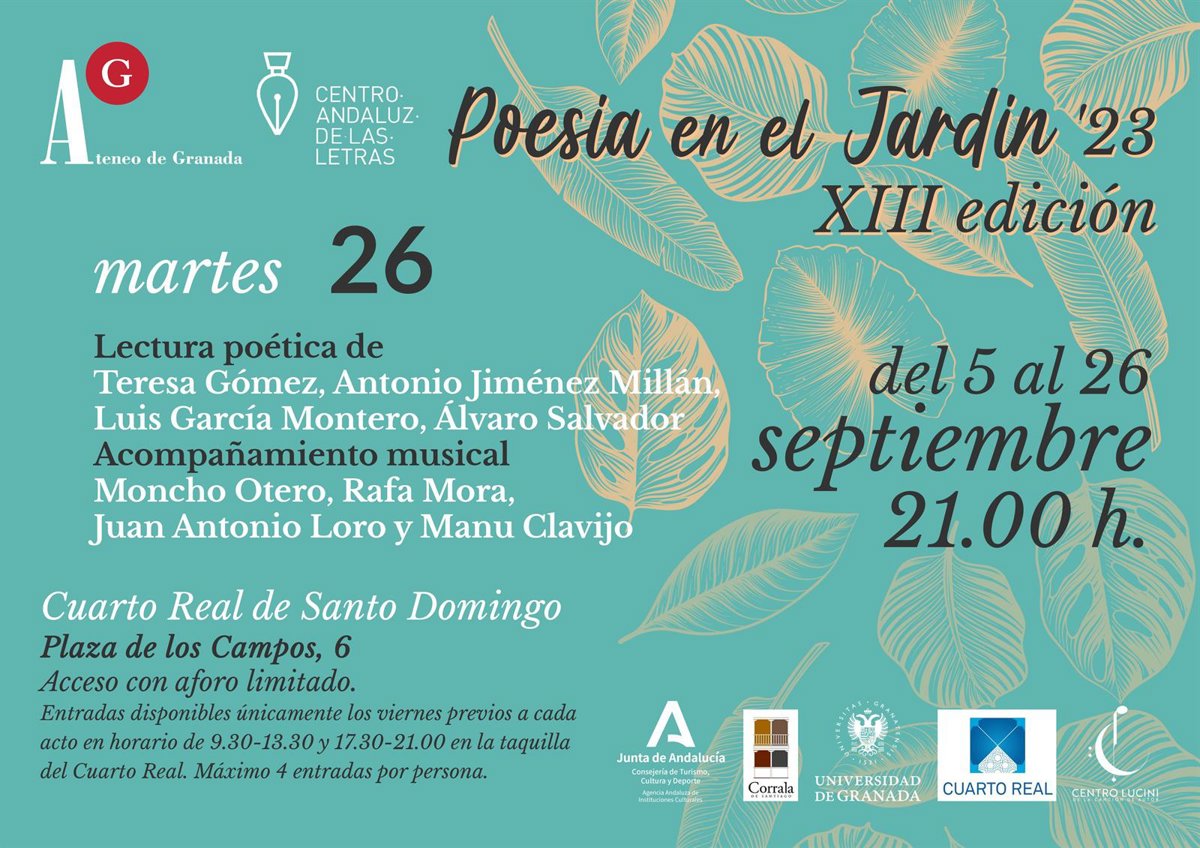 Tras 12 años de vida, 'Poesía en el Jardín' se ha organizado en esta ocasión a partir del trabajo conjunto del Centro Andaluz de las Letras de la Agencia Andaluza de Instituciones Culturales y el Ateneo de Granada con la colaboración de la Residencia Universitaria La Corrala de la Universidad de Granada, de la Fundación Albayzín de la Delegación de Turismo y Cultura del Ayuntamiento de Granada y del Centro Lucini de la canción de autor.