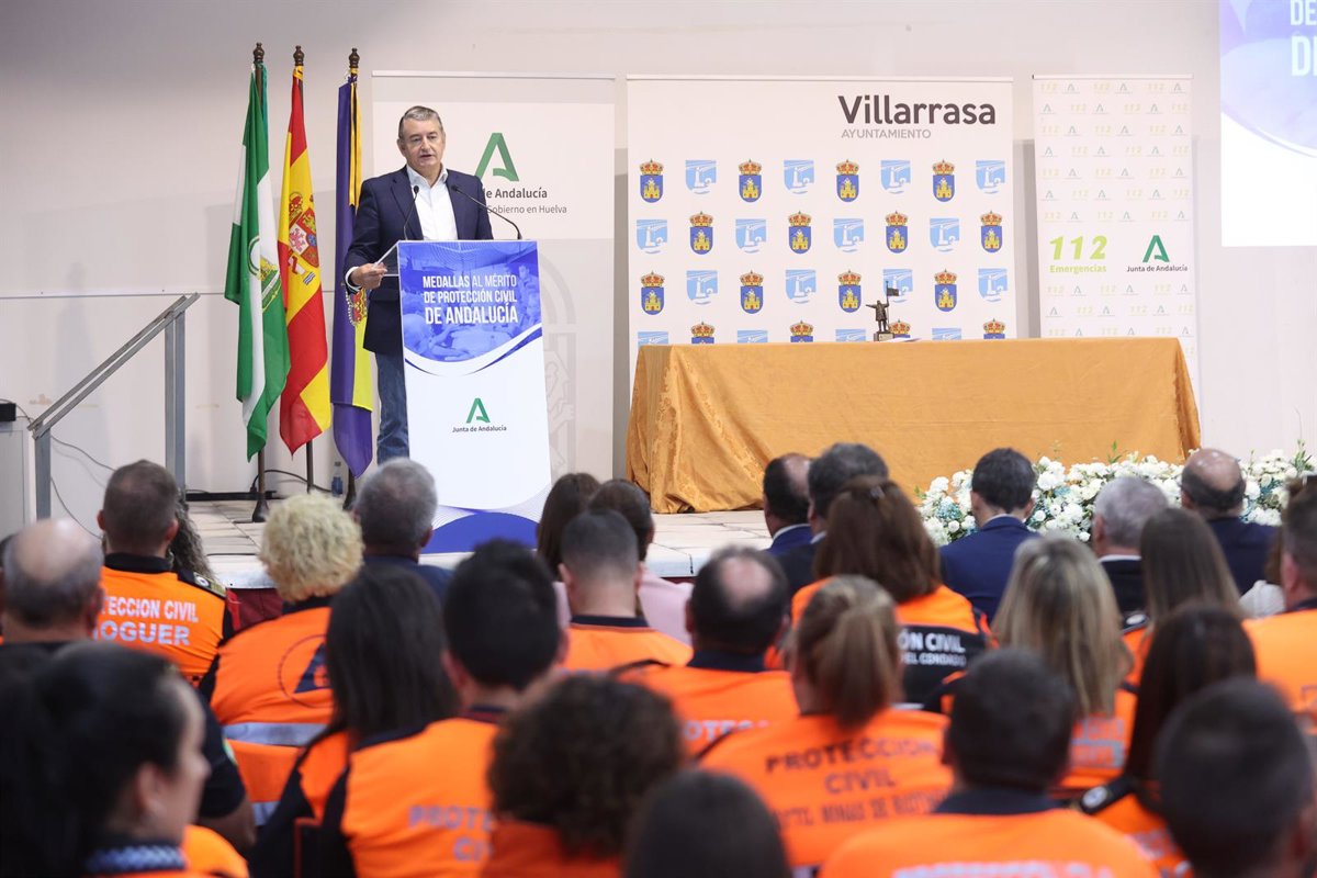 El consejero de la Presidencia, Interior, Diálogo Social y Simplificación Administrativa de la Junta, Antonio Sanz, ha hecho este sábado entrega de las Medallas de Oro al Mérito de Protección Civil a 25 Agrupaciones Locales del Voluntariado de Protección Civil de la provincia de Huelva, en un acto celebrado en el municipio de Villarrasa.