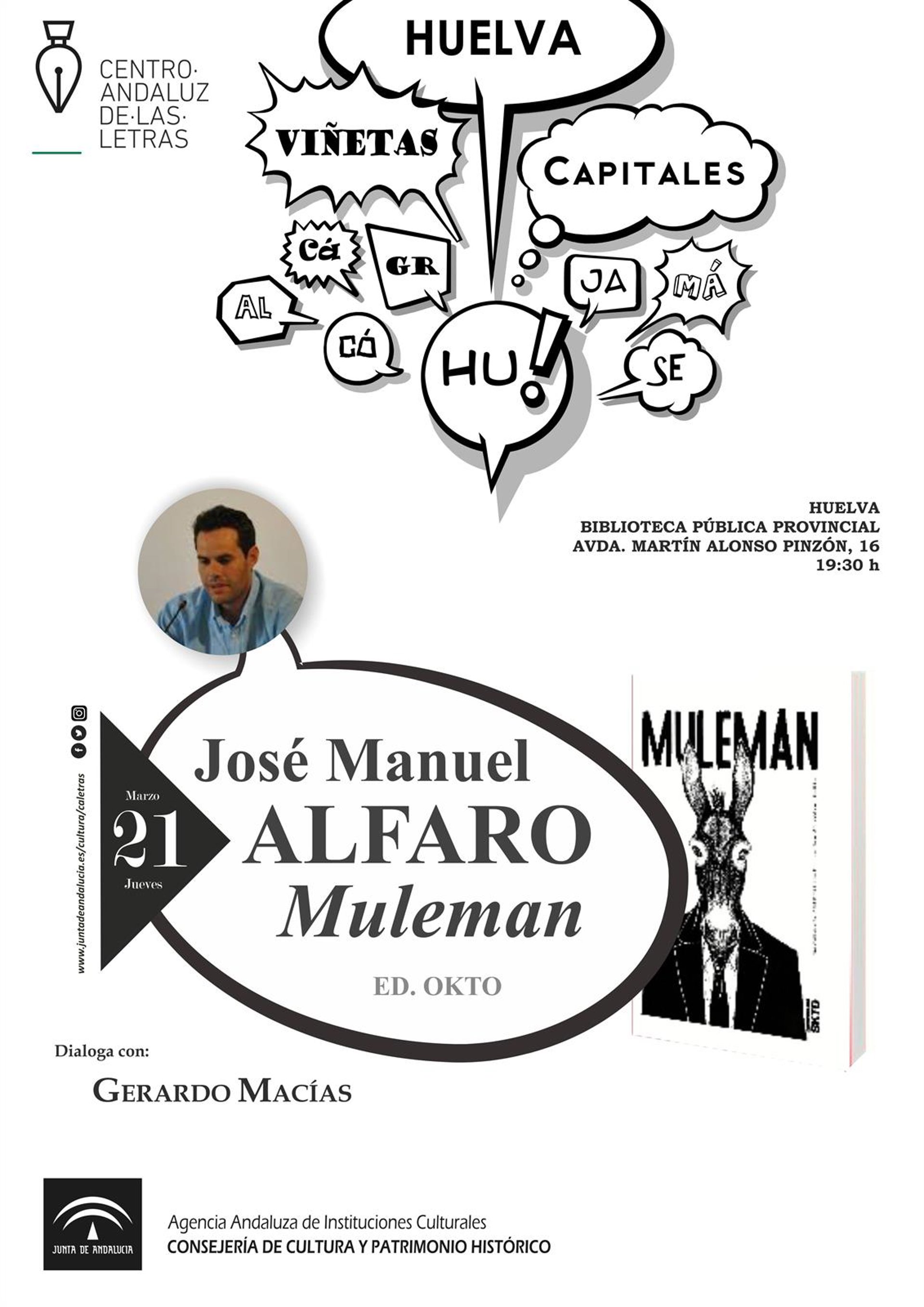 La Consejería de Cultura y Patrimonio Histórico, a través del Centro Andaluz de las Letras, ha organizado este jueves a las 19,30 horas en Huelva la presentación del álbum ilustrado 'Muleman' de José Manuel Alfaro, dentro del ciclo 'Viñetas Capitales'.