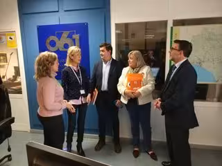 Durante la visita, la responsable provincial de la Consejería de Salud y Familias ha conocido el funcionamiento del Centro Coordinador de Urgencias y Emergencias de Huelva y sede del servicio del 061, desde donde se atiende una media diaria de 214 peticiones de asistencia urgente o emergente de toda la provincia.