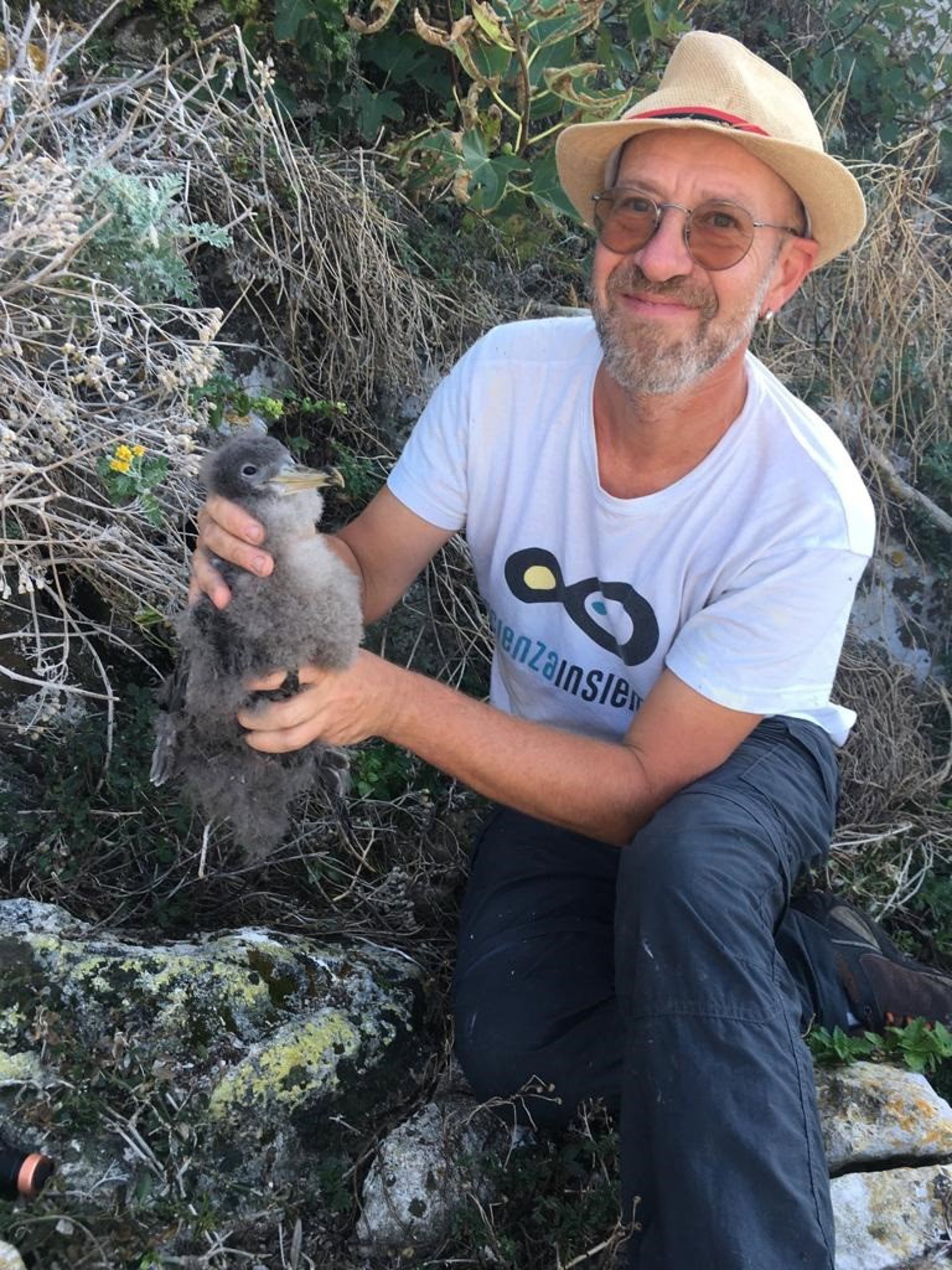 Massimo Sacchi, del Instituto Superior de Investigación y Protección del Medio Ambiente (ISPRA) de Italia, también autor del artículo, con una de las pardelas cenicientas estudiadas. - FUNDACIÓN DESCUBRE