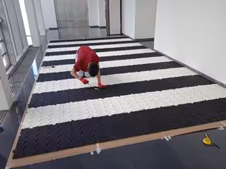 El paso de peatones se va formando como un puzle con baldosas blancas y negras de cincuenta centímetros cuadrados, realizadas con resina, polvos fotoluminiscentes y microesferas de vidrio. De esta manera, se pueden aplicar a cualquier vía y con cualquier distancia con sólo sumar y adaptar las losas. Una vez formada la alfombra se fijan con unos dispositivos que anclan el paso al suelo. Esta estructura permite también su reutilización en otras ubicaciones.