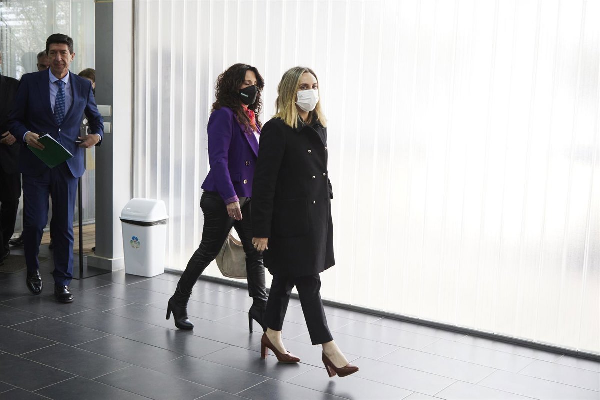 La consejera de Igualdad, Políticas Sociales y Conciliación, Rocío Ruíz, (d) junto a la consejera de Fomento, Marifrán Carazo (d) durante la rueda de prensa tras Consejo de Gobierno de la Junta de Andalucía en el Monasterio de Santa María de la Rábida, - Joaquin Corchero - Europa Press