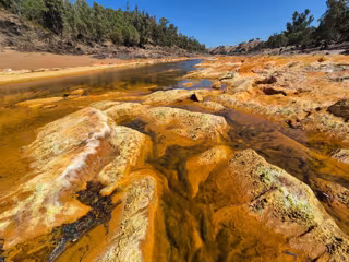 Toda esta larga actividad ha originado un peculiar paisaje, "propio de otro mundo". El nombre del río proviene de su color rojizo, que pasa a ocre en las orillas. Estas tonalidades, desde los albores de la historia, se deben al alto contenido en sales ferruginosas y sulfato férrico que, junto a la escasez de oxígeno, otorgan un pH muy ácido. En las orillas se presentan estructuras características, resultado del enfriamiento de la escoria y los residuos mineros.