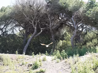 El cárabo vuela tras ser soltado en la zona de la acción de reforestación de pinos, alcornoques y sabinas en Nuevo Portil (Cartaya). - JUNTA DE ANDALUCÍA