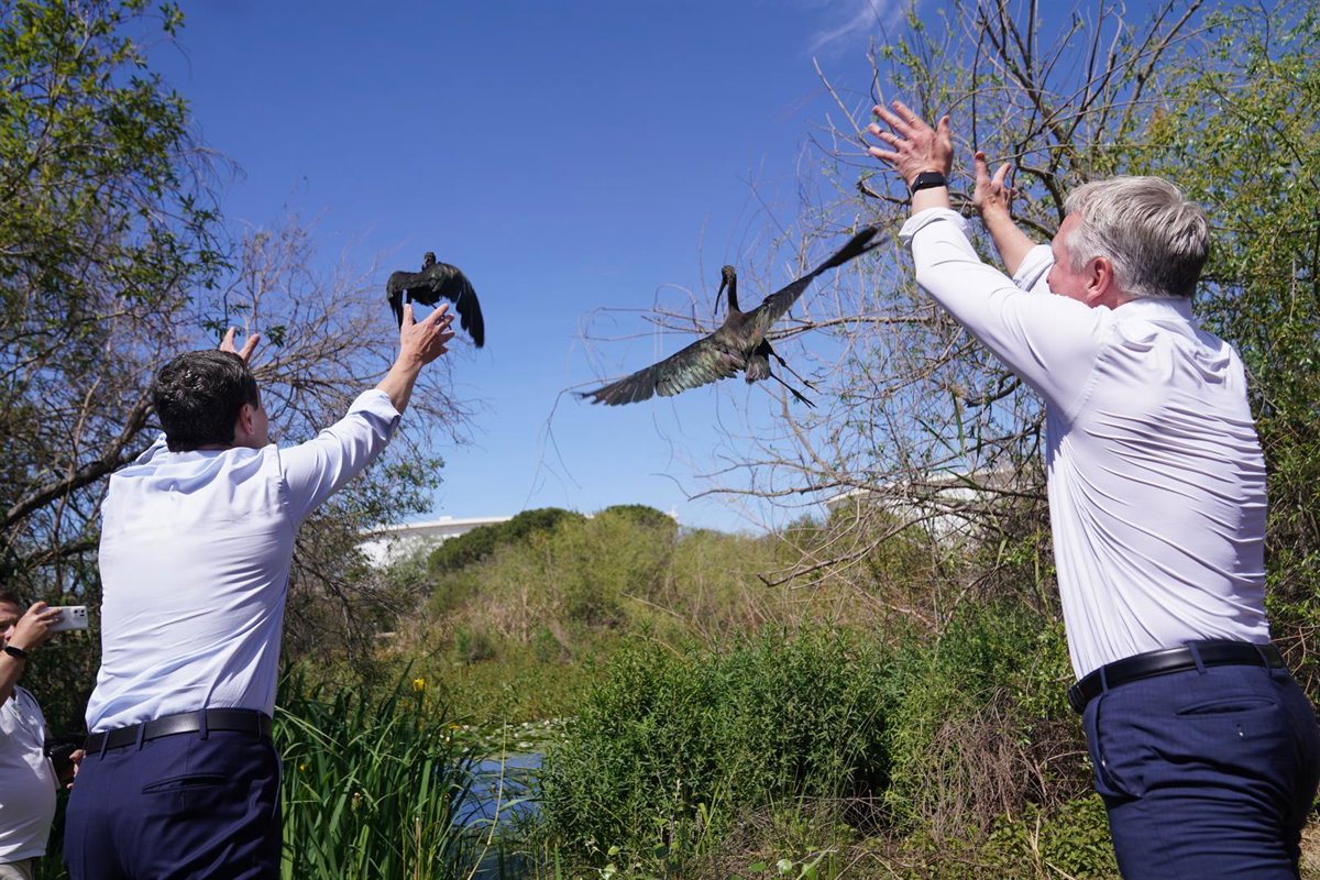 El presidente de la Junta, Juanma Moreno, en la suelta de un ave acuática en la Laguna Primera de Palos. - JUNTA DE ANDALUCÍA