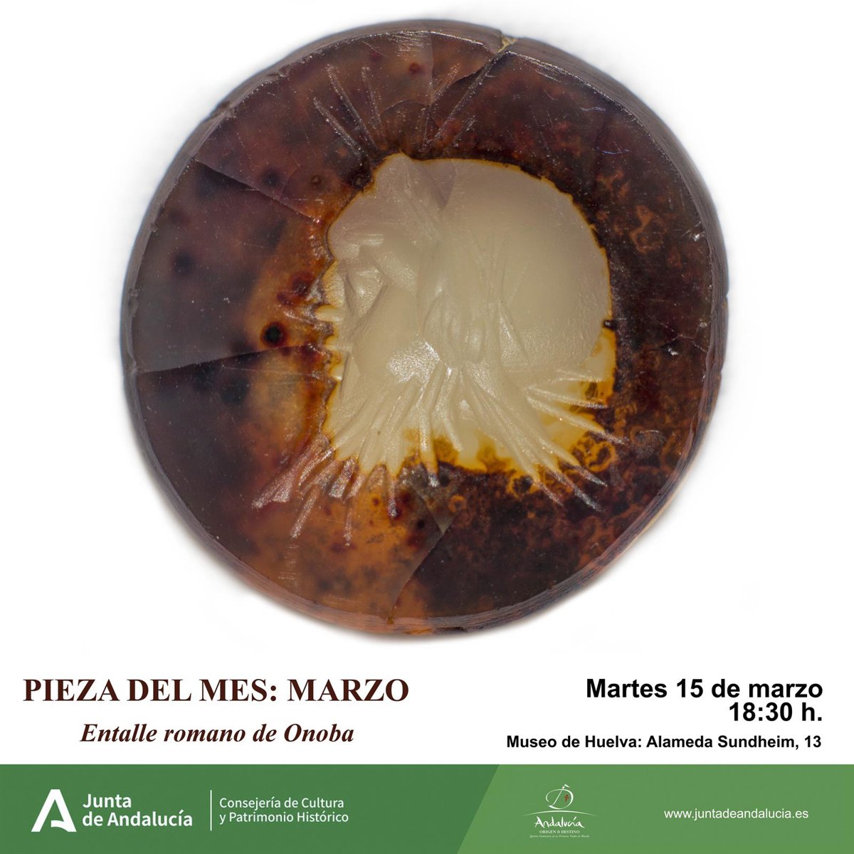 El Museo de Huelva se acerca este martes, a partir de las 18,30 horas, a la ciudad portuaria de Onoba, de la mano del Doctor Salvador Delgado Aguilar, profesor del Master de Profesorado de la Universidad Antonio Nebrija y arqueólogo en Ánfora GIP, quien abordará el entalle romano durante la conferencia 'La Pieza del Mes'.