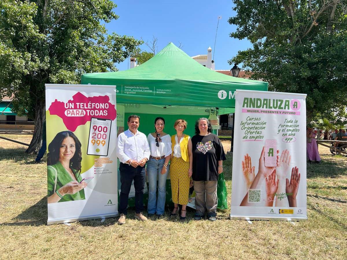 La directora del Instituto Andaluz de la Mujer, Olga Carrión y José Manuel Borrero en el punto InfoMujer de El Rocío junto al personal que lo atiende. - JUNTA DE ANDALUCÍA