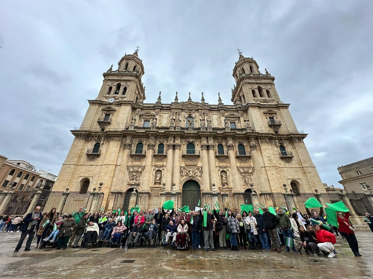 Con la Catedral de Jaén como telón de fondo, miembros de distintas asociaciones de personas con discapacidad han portado cartulinas blancas y verdes con las que han conformado la bandera de Andalucía, además de dar lectura a frases alusivas a la discapacidad y al sentimiento que genera la enseña de la región.