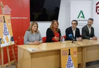 Junto a Javier Barajas, presidente de la entidad colegial, Hidalgo ha explicado que esta campaña es fruto de un convenio establecido con los Administradores de Fincas de Andalucía con el objetivo de animar a las comunidades de vecinos "a no hacer oídos sordos ante situaciones de violencia contra las mujeres".