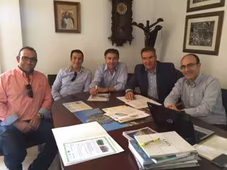 El delegado de Agricultura y Medio Ambiente de la Junta en Jaén, Sebastián Quirós, junto al alcalde de Navas de San Juan, Joaquín Estrella, se han reunido este viernes con responsables de la Asociación de Productores de Pistacho y Comercializadores de Jaén (Appistaco) para abordar la futura firma de un convenio con el que facilitar asesoramiento, investigación y formación a los productores.