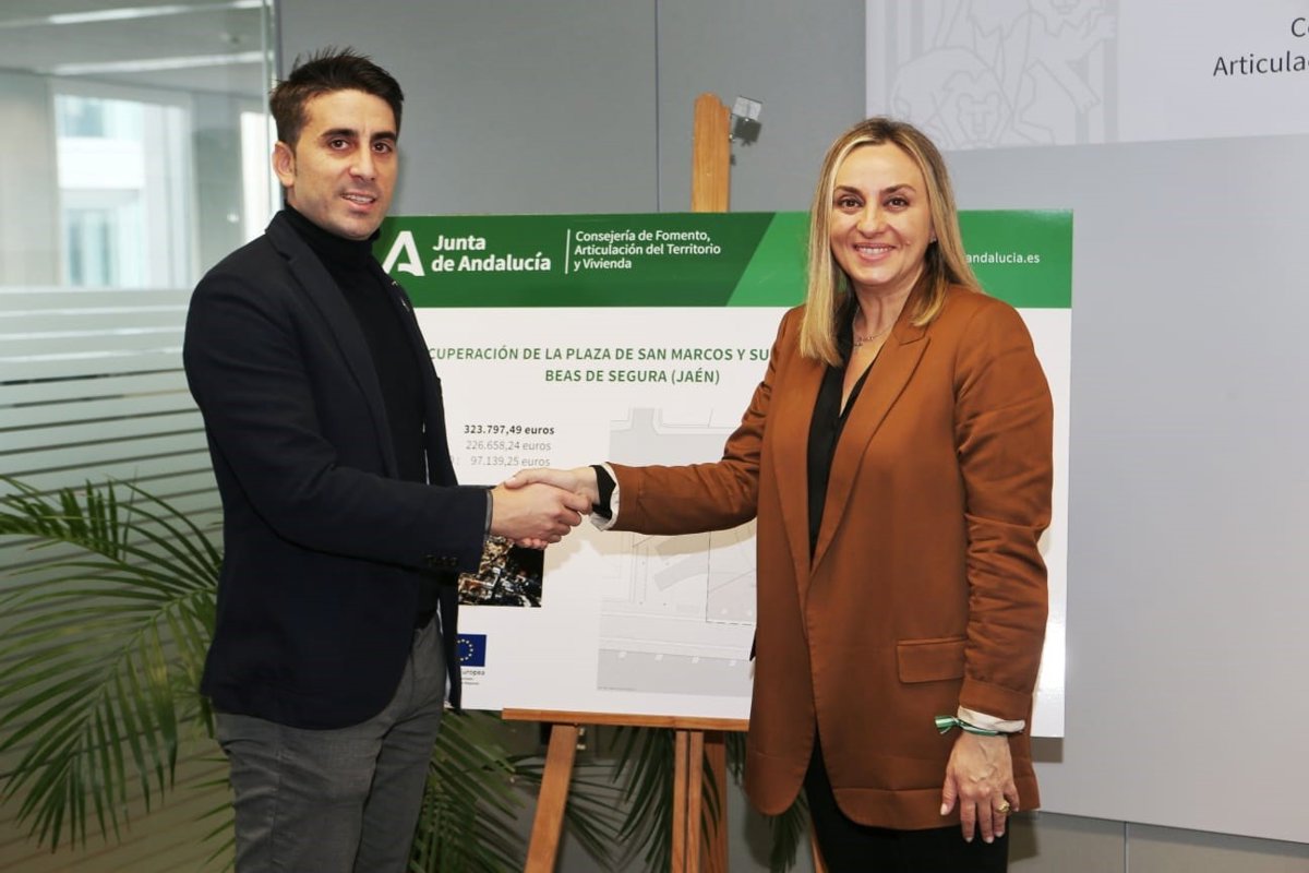 Las obras de remodelación integral de la plaza de San Marcos, en Beas de Segura (Jaén), comenzarán este año después de que la consejera de Fomento, Articulación del Territorio y Vivienda, Marifrán Carazo, y el alcalde de Beas de Segura, José Alberto Rodríguez, hayan firmado este miércoles el convenio de colaboración que permitirá intervenir en este emblemático espacio.