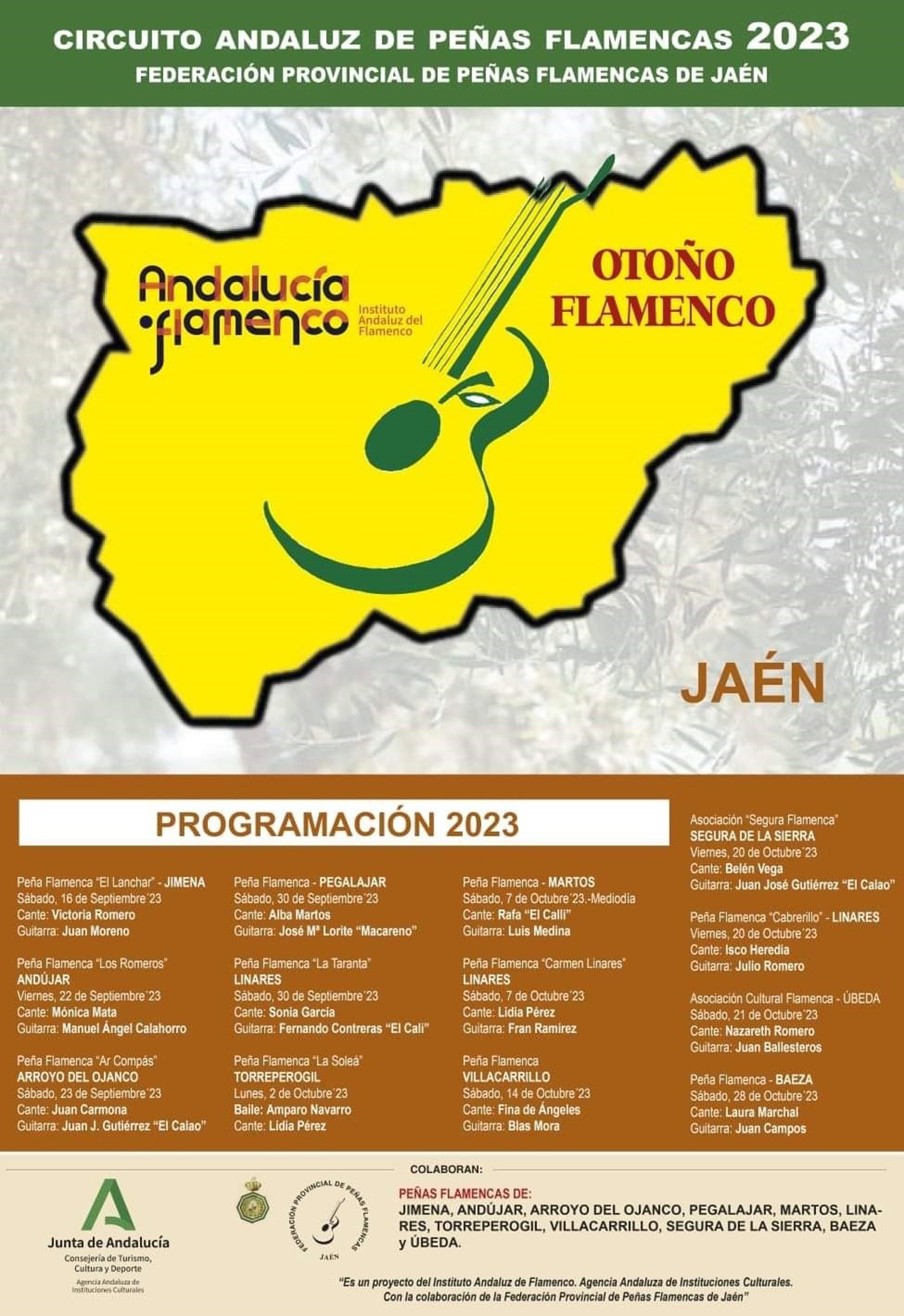 El 14 de octubre, la Peña Flamenca de Villacarrillo acogerá la actuación de la cantaora Fina de Ángeles, con Blas Mora a la guitarra, y el día 20 la Asociación Segura Flamenca, de Segura de la Sierra, la de Belén Vega al cante y Juan J. Gutiérrez 'El Calao' a la guitarra.