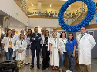 Además, en la noche de este pasado lunes el centro se iluminó de azul intenso para conmemorar el día mundial de esta enfermedad tan prevalente, y esta mañana se han repartido lazos y pulseras azules a los usuarios del patio azul de consultas, que ha lucido un gigantesco arco de globos azules donde se han montado las mesas de información a los pacientes y se han llevado a cabo estas actividades.