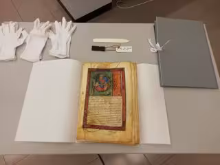 Igualmente, se trató la acidez del documento mediante la aplicación de una disolución alcalina de Óxido de Magnesio. Una vez estabilizado y tratado el soporte, se procedió a reintegrar las faltas que tenía, lo que se realizó mediante injertos en papel vitela y pergamino de similar color. Después de los injertos se reintegraron cromáticamente las pérdidas de capa pictórica con acuarela con la técnica de puntos. Por último, se protegieron las ilustraciones con un Fijativo en Spray, para asegurar una mayor conservación.