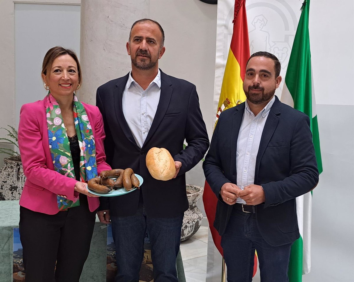 La delegada del Gobierno andaluz en Málaga, Patricia Navarro; el alcalde de Canillas de Aceituno, Vicente Campos, y el primer teniente alcalde, Álvaro Hurtado, presentan el Día de la Morcilla de Canillas de Aceituno - JUNTA