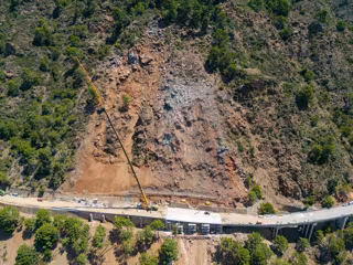 Para reconstruir la carretera ha sido necesario antes ejecutar medidas para garantizar la estabilidad del talud, retirando todas las rocas inestables con maquinaria pesada, medios manuales con especialistas en trabajos verticales y, en último lugar, micro voladuras controladas.