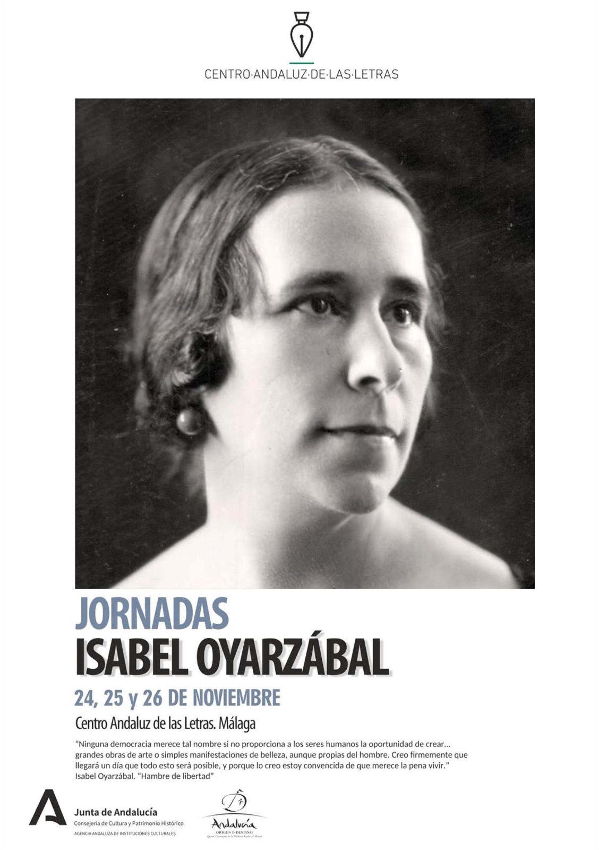 La Consejería de Cultura y Patrimonio Histórico, a través de la Agencia Andaluza de Instituciones Culturales, organizan en Málaga unas jornadas de estudio sobre la periodista, escritora, dramaturga y diplomática Isabel Oyarzábal Smith (Málaga, 1878 - México, 1974). El encuentro, que se celebrará del 24 al 26 de noviembre en el Centro Andaluz de las Letras, podrá seguirse en directo por streaming a través de la cuenta Cultura Cuenta en Youtube.