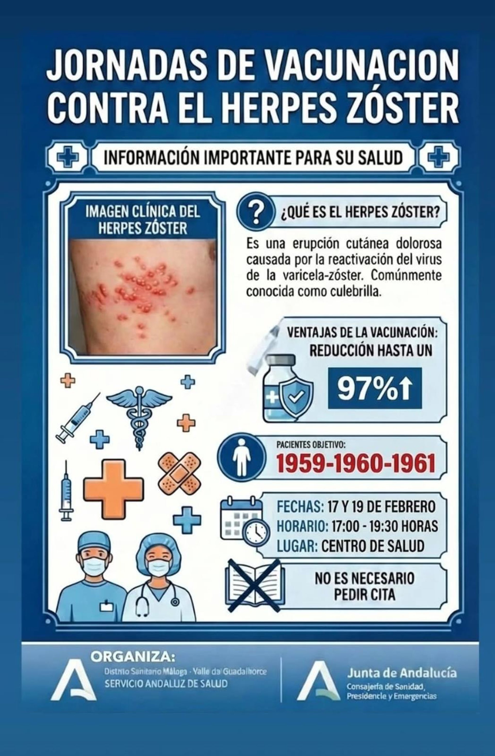 El Distrito Sanitario Málaga-Valle del Guadalhorce, perteneciente al Servicio Andaluz de Salud (SAS) de la Consejería de Sanidad, Presidencia y Emergencias de la Junta de Andalucía, ofrece este mes dos jornadas de vacunación sin cita contra el virus de Herpes Zoster.