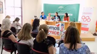 La asesora de programa del IAM en Málaga, María Encarnación Santiago; la presidenta de la Asociación de Mujeres Berenice, Rocío Calleja y la creadora de Pedrita Parker, Estefi Martínez, junto con la delegada territorial de Educación, Deporte, Igualdad, Políticas Sociales y Conciliación, Mercedes García Paine, han presentado esta guía 'Libres y valientes, para la prevención del acoso y agresión sexual en la juventud'.