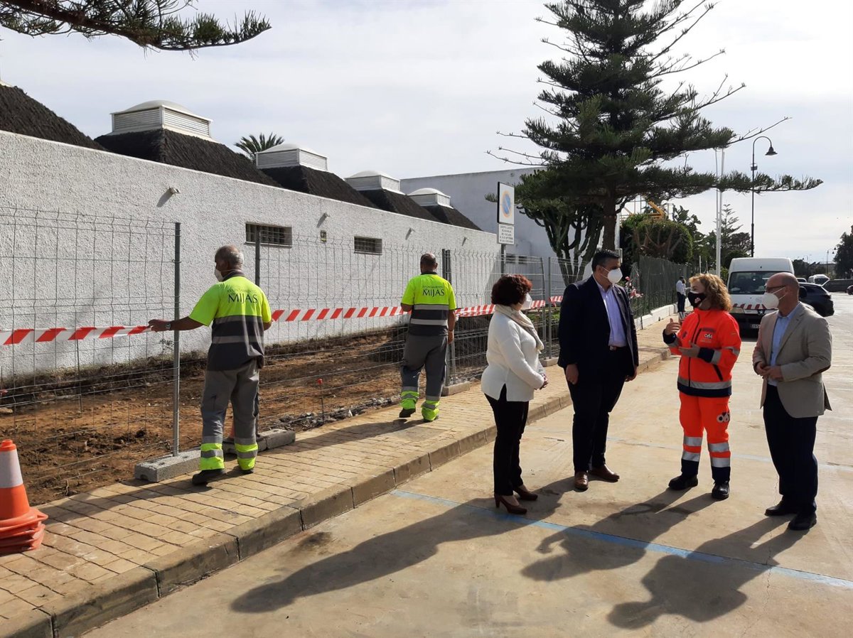 La directora de la Empresa Pública de Emergencias Sanitarias 061 en Málaga, Belén Lozano, y el alcalde de Mijas, Josele González, han visitado este miércoles los terrenos cedidos por el Consistorio, acompañados por la concejala de Sanidad, María del Carmen González.
