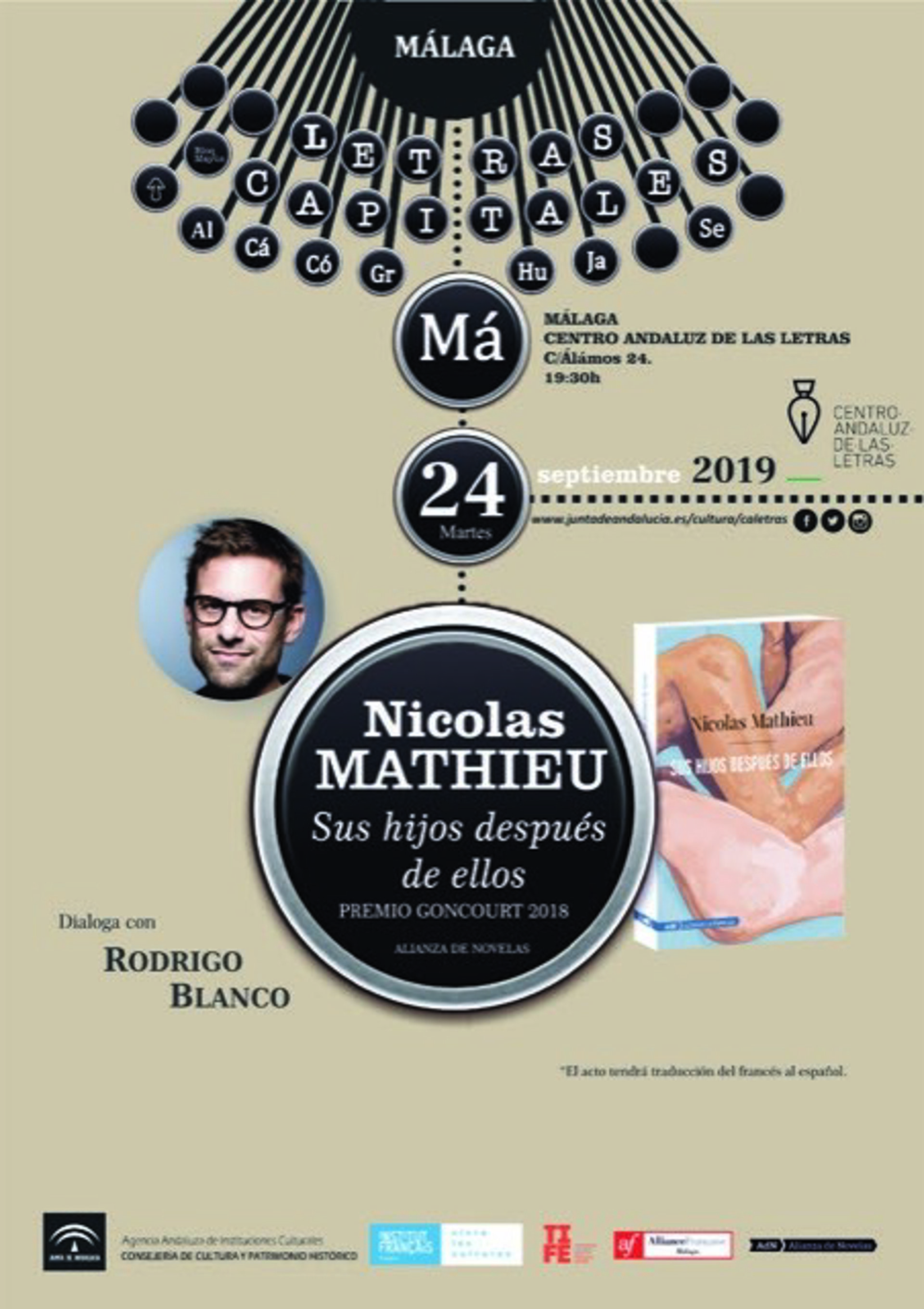 La Consejería de Cultura y Patrimonio Histórico, a través del Centro Andaluz de las Letras (CAL), junto con el Institut Franais de Sevilla, la Alianza Francesa de Málaga y la editorial Alianza de Novelas, organizan este martes día 24 en Málaga la presentación de la nueva novela de escritor Nicolas Mathieu 'Sus hijos después de ellos', galardonado con el Premio Goncourt 2018.