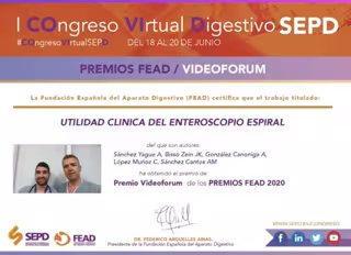 El servicio de Aparato Digestivo del Hospital Costa del Sol de Marbella (Málaga) ha recibido el premio al mejor videoforum de los premios Fundación Española de Aparato Digestivo (FEAD) por un proyecto audiovisual sobre la 'Utilidad del Enteroscopio Espiral', en el I Congreso Virtual de Digestivo organizado por la Sociedad Española de Patología Digestiva (SEPD).